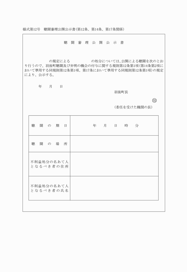 第十二条 行政庁は、法第二十条第六項若しくは条例第二十条第六項の規定により聴聞の期日における審理の公開を相当と認めたとき又は法令(条例第二条第二号に規定する法令をいう)の規定により聴聞の期日における審理を公開すべきときは、聴聞審理公開公示書(様式第十二号)により公示するものとする。