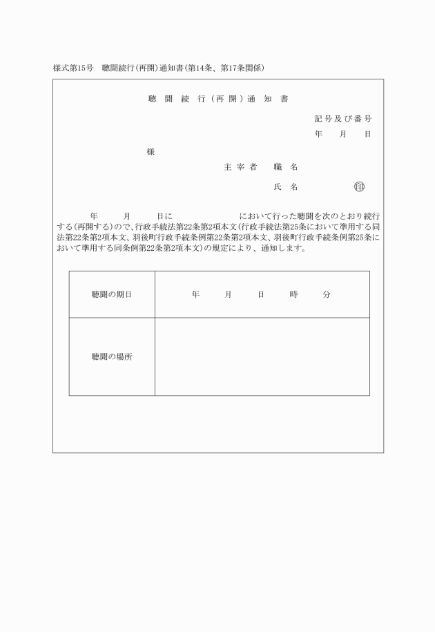 第十四条 法第二十二条第二項本文又は条例第二十二条第二項本文の規定による通知は、聴聞続行(再開)通知書(様式第十五号)によるものとする。