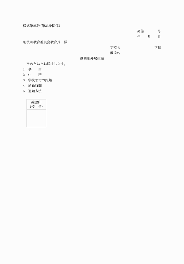 第三十三条 羽後町外に居住し通勤する者は、様式第二十五号による勤務地外居住届を校長を経て教育長に提出するものとする。