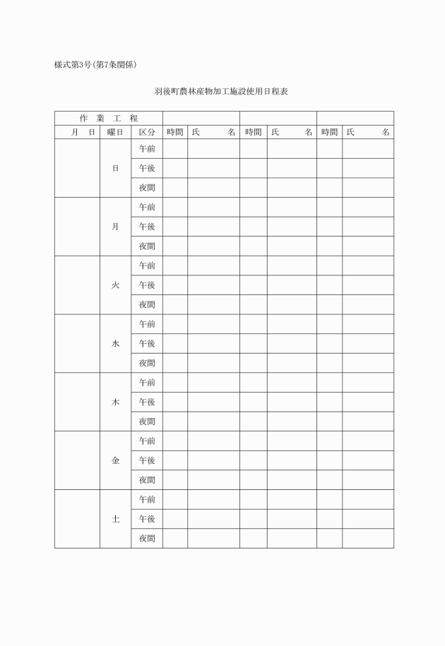 3 管理者は、加工施設の使用を承認したときは、加工施設使用日程表(様式第三号)に記載しなければならない。
